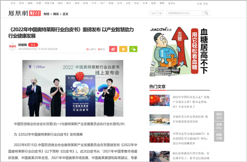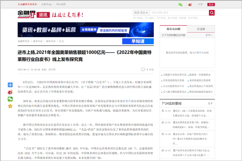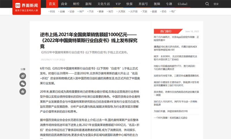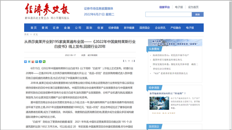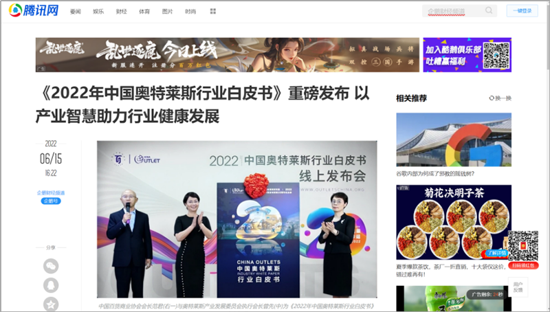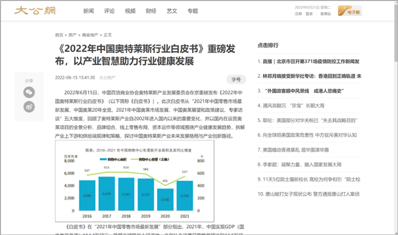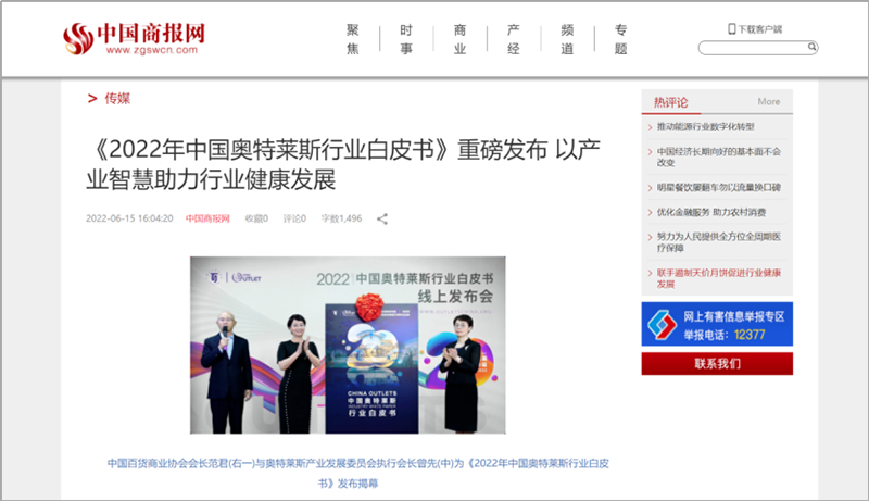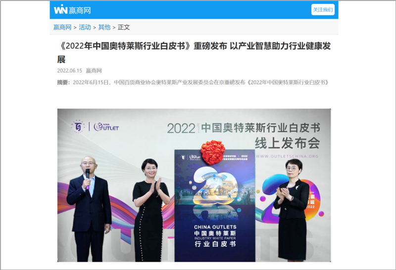 2022年6月15日,中國百貨商業(yè)協(xié)會(huì)奧特萊斯產(chǎn)業(yè)發(fā)展委員會(huì)線上直播發(fā)布《2022年中國奧特萊斯行業(yè)白皮書》。白皮書中“2021年中國零售市場(chǎng)最新發(fā)展、中國奧萊20年全覽、2021年中國奧萊市場(chǎng)發(fā)展、中國奧萊展望和政策建議、專家訪談”等內(nèi)容吸引政府領(lǐng)導(dǎo)、專業(yè)機(jī)構(gòu)、產(chǎn)業(yè)運(yùn)營商、品牌商、服務(wù)商、媒體記者及眾多奧萊消費(fèi)者共計(jì)20余萬人參會(huì),成為國內(nèi)奧萊行業(yè)年度一大焦點(diǎn)。