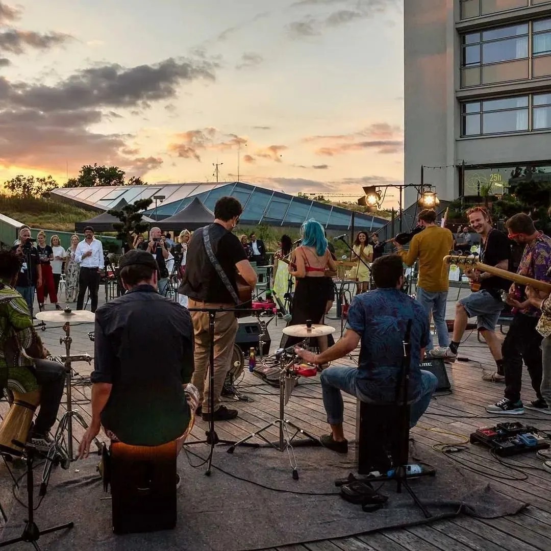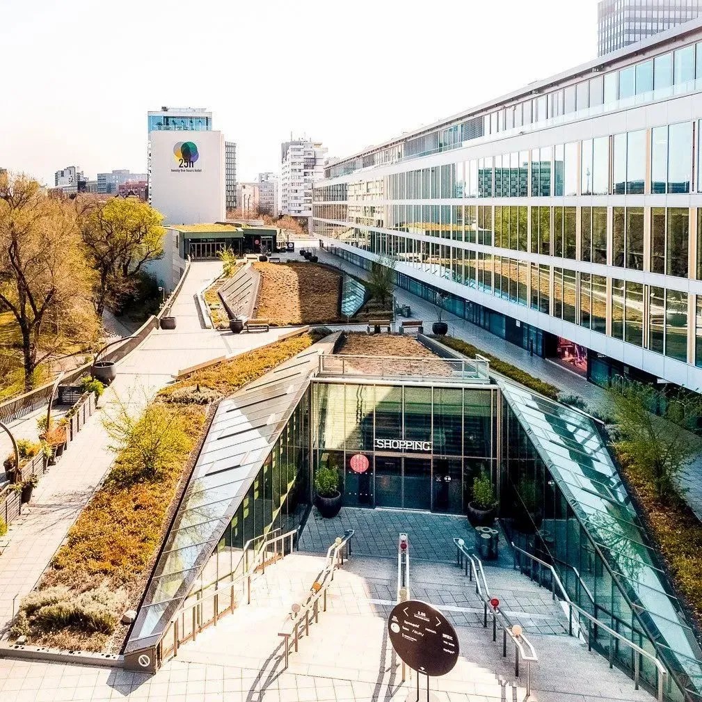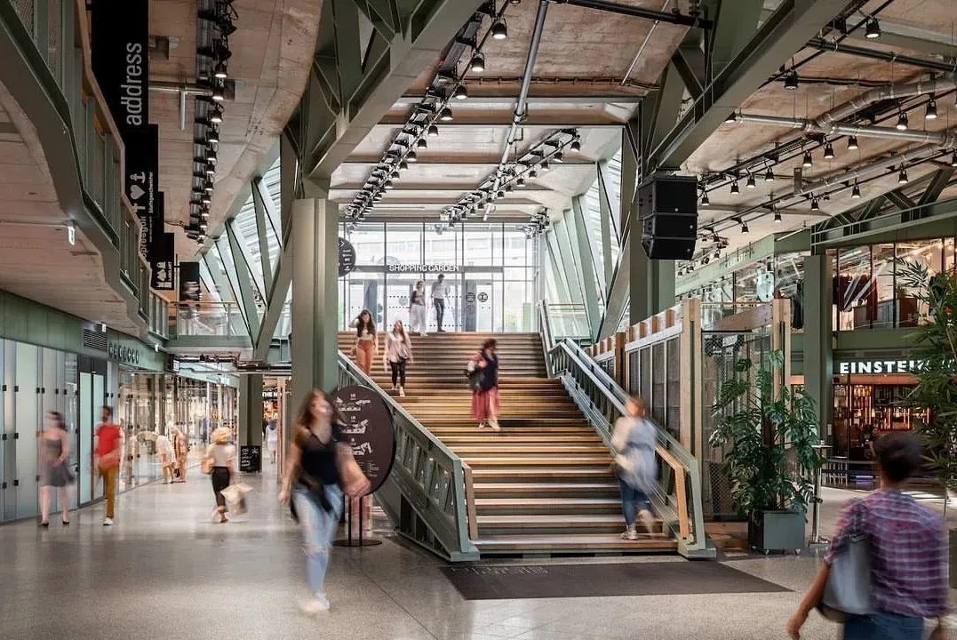 在商業(yè)的二層則設置了一個開放、通透的公共空間,同柏林潮流酒店25小時(Twenty five hours hotel)進行聯(lián)通。并以城市綠洲為設計概念,在頂層設計了一個布滿植物盆栽的七千平方公尺的天臺,供給顧客休憩社交,營造自由、無拘束的商業(yè)氛圍,與項目的整體定位相得益彰。