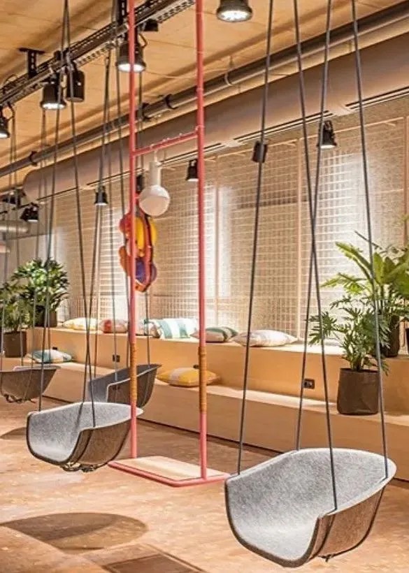 空間以明亮的粉彩和摩登風格將顧客帶入加利福尼亞的風情世界,還通過一系列不同尋常的材料組合,為顧客提供不一樣觸覺、視覺體驗的潮酷餐飲空間。顧客可以選擇坐在落地窗前邊品嘗美食,邊欣賞對面動物園的猴山;也可以選擇以鳥籠為靈感設計的沙發(fā)區(qū),或是以階梯座的秋千林立的休閑區(qū)等。