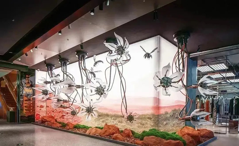 正如北京SKP-S內的“未來農場”以仿生羊為亮點,成都“平行世界”里猩猩漫步太空引人遐想,武漢SKP亦在負一層SKP-S精心構建了特色主題藝術空間《EARTH 2124》。該空間巧妙劃分為三大區(qū)域:北極熊區(qū)《無邊的浮冰》,寓意著冰川的消融與生命的掙扎;走廊區(qū)《新大陸架》,象征著未來世界的重構與探索;企鵝區(qū)《覆羽》,則是對極地生物適應環(huán)境、重獲新生的美好愿景。整個空間緊扣“以未來之眼審視全球變暖,攜手極地生靈共繪新篇章”的深刻主題。