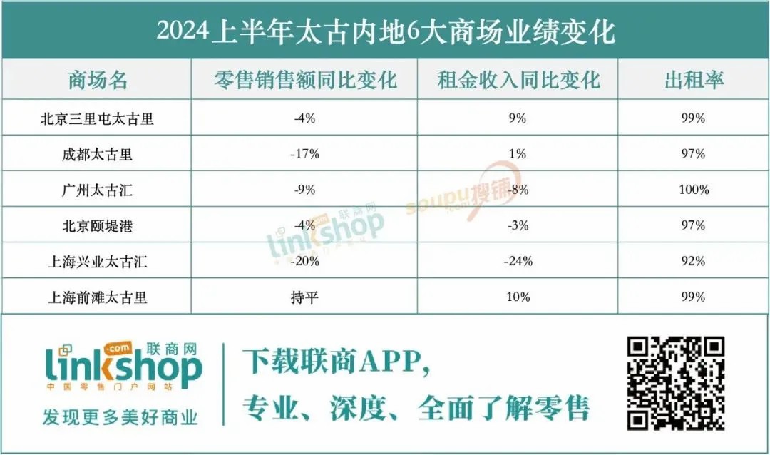 針對中國內(nèi)地市場,太古地產(chǎn)的零售物業(yè)在上半年表現(xiàn)出一定的分化趨勢。盡管整體零售銷售額實(shí)現(xiàn)了4%的同比增長,但具體到各個(gè)商場項(xiàng)目時(shí),可以發(fā)現(xiàn)高端商場與綜合類商場之間存在明顯差異。高端商場普遍面臨銷售下滑的挑戰(zhàn),而綜合類商場則相對保持了穩(wěn)定。