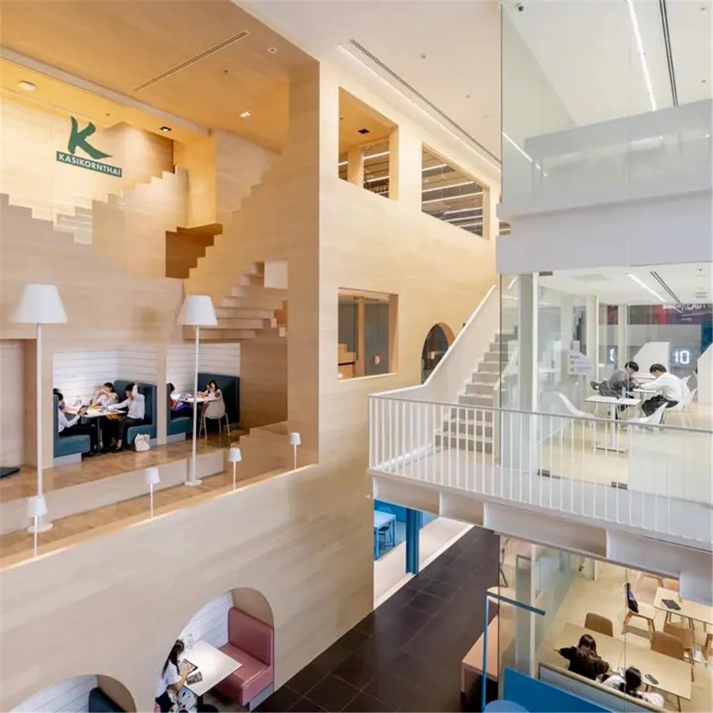 SAMYAN CO-OP是購物中心二樓的共享空間,含5個獨立又相連的建筑,設(shè)自習(xí)室、討論室、會議室等,對外開放租賃。一樓售日常用品,二樓為生活服務(wù)類店鋪,三樓融合泰國傳統(tǒng)與現(xiàn)代藝術(shù)風(fēng)格的空間。