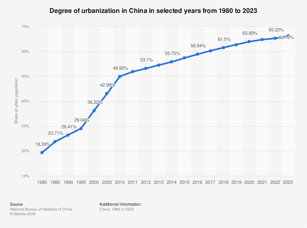 報(bào)告中顯示,2023年末,我國(guó)城鎮(zhèn)常住人口已經(jīng)達(dá)到了9.3億,城鎮(zhèn)化率66.16%,即,每三個(gè)中國(guó)人中,有兩個(gè)生活在城市里。此外,我國(guó)地級(jí)以上城市常住人口達(dá)到6.7億人,常住人口超過(guò)500萬(wàn)的城市有29個(gè)。