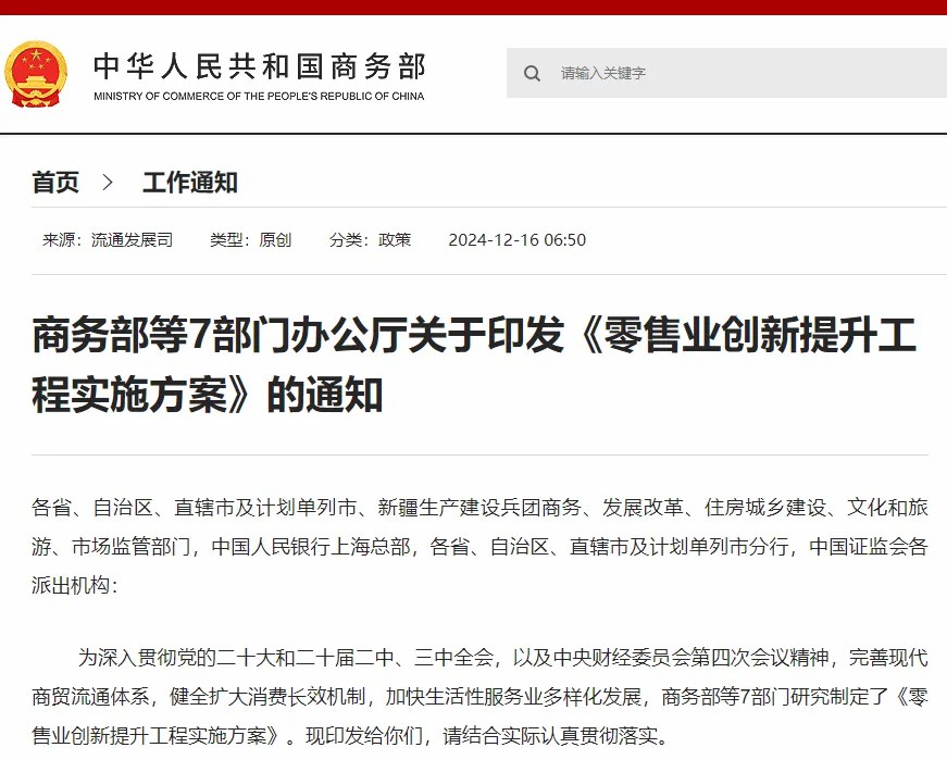 對(duì)實(shí)體商業(yè)而言,12月16日,商務(wù)部等七部門(mén)辦公廳聯(lián)合印發(fā)《零售業(yè)創(chuàng)新提升工程實(shí)施方案》(以下簡(jiǎn)稱(chēng)《方案》),旨在推動(dòng)商業(yè)場(chǎng)景化改造、多元化業(yè)態(tài)融合創(chuàng)新、品質(zhì)化產(chǎn)品和服務(wù)供給、數(shù)字化賦能、產(chǎn)業(yè)鏈協(xié)同降本增效。