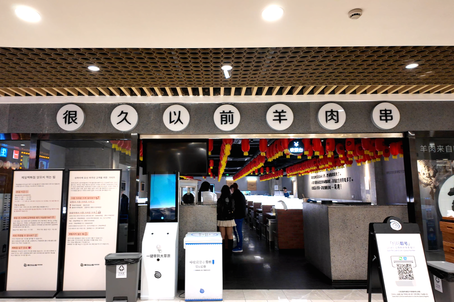 值得一提的是,在國(guó)家開(kāi)放免簽政策,韓國(guó)旅客接踵而至,其統(tǒng)一的打卡模式直接帶火了“很久以前羊肉串”,尚未到正式的用餐時(shí)間,該門(mén)店前已開(kāi)始排隊(duì),其中大部分等位人員為韓國(guó)游客。他們除了可以在店員的輔助下使用烤爐現(xiàn)烤現(xiàn)吃,還將門(mén)店附贈(zèng)的“冰涼貼”作為了打卡的必備項(xiàng)目。