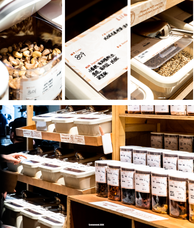 據(jù)了解,門(mén)店貨架上的瓶瓶罐罐整齊碼放,客人可以自行挑選或diy不同的搭配,整個(gè)過(guò)程好玩又解壓。Lila主要賣有機(jī)干糧、果干以及無(wú)添加零食,像凍干山楂、無(wú)花果、無(wú)糖棉花、藜麥等,目前大約有100多種可選。